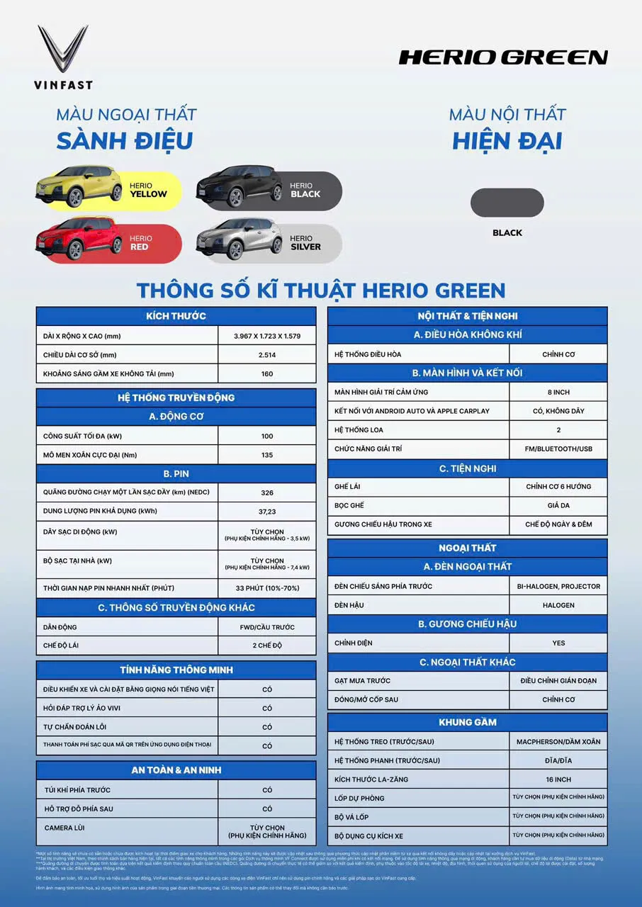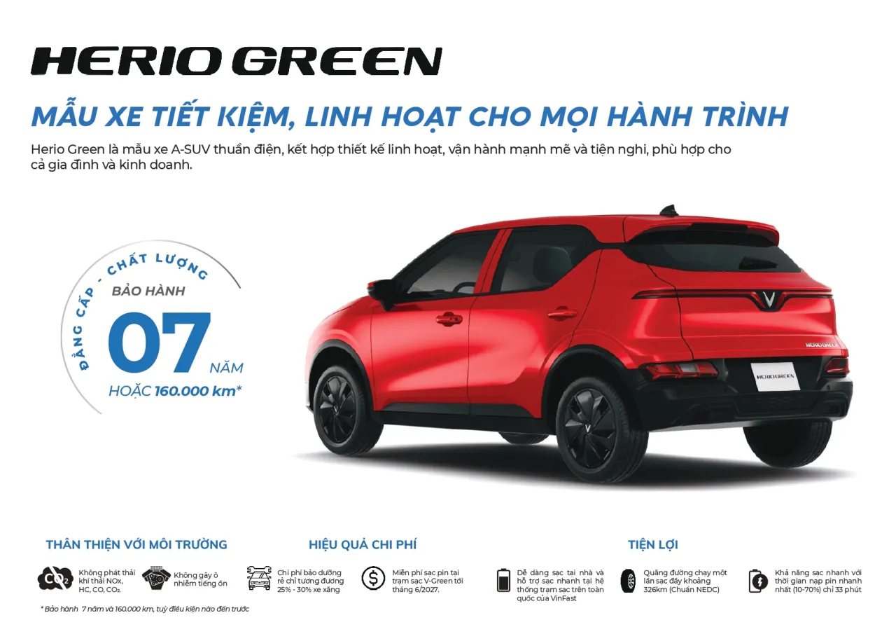 Herio Green sở hữu công suất động cơ mạnh nhất phân khúc, giúp tăng tốc nhanh, vận hành êm ái và linh hoạt trên phố. Được thiết kế gọn gàng nhưng đầy năng lượng, công suất và lực kéo vượt trội, trang bị túi khí nhiều nhất phân khúc, đảm bảo an toàn trên nhiều địa hình, Herio Green phù hợp cho cả nhu cầu di chuyển cá nhân và dịch vụ vận doanh.